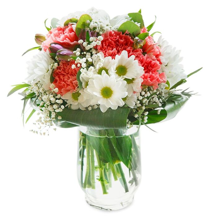 There is a joyful spontaneity in this bouquet, a feeling as if the lushness of Stroud Green in springtime has been gathered into a single uplifting gesture. Velvety coral carnations and vivid red blooms nestle beside bright white daisies with their cheerful yellow-green eyes, creating a composition full of optimism similar to a morning walk past the bustling shops of Stroud Green Road. Tiny white baby's breath blossoms weave throughout, their airy presence like laughter shared with neighbours, while just a hint of unopened, purple-tinged buds on one side adds a sense of promise. Dark green, glossy leaves cradle the arrangement, enveloping each stem in a rich embrace reminiscent of the greenery found in local gardens. Nestled upright in a pristine white bag with sturdy handles, the bouquet is ready to brighten doorsteps from Upper Tollington Park to Crouch Hill. Each flower has been chosen and placed with care, creating a fullness and freshness that encapsulate both artistry and sincerity-perfect for birthdays, congratulations, or any day that could use a little extra brightness, all lovingly arranged by someone who knows Stroud Green's community spirit. Reflecting the gentle optimism of a Stroud Green morning, this cheerful bouquet showcases a delightful mixture of classic white daisies and ruffled coral carnations, gathered by florists who know the area's leafy parks and charming mews by heart. A swirl of soft eucalyptus foliage mingles with frothy white gypsophila, imparting not only visual lightness but a sense of natural tranquility you might find at the edge of Finsbury Park. The arrangement is elegantly circular and full, each blossom radiating outward in harmonious waves-the white petals and green centres of the daisies glowing amidst a sea of coral and blush. Nestled within are a few delicate alstroemeria buds, their deeper pink and purple streaks weaving discreet surprises into the composition. The overall effect suggests ease and sophistication, offering feelings of calm and quiet celebration perfect for marking birthdays, anniversaries, or simply sharing a thoughtful token with loved ones across Stroud Green and beyond. Expertly crafted for local delivery, this bouquet brings artistry, freshness, and a breath of the outdoors into every home or office it enters. This bouquet brings together the effortless freshness and joyful colour palette beloved by Stroud Green flower enthusiasts. At its heart, coral-pink carnations gather in a lively, textured display, their densely clustered petals radiating warmth like early morning sunlight streaming over Station Place. Surrounding them, multi-petaled white chrysanthemums and dainty, green-eyed daisies provide sparkling contrast, creating a feeling of youthful brightness and unspoken optimism. Wisps of pure gypsophila float between the larger blooms, offering gentle softness that tempers the design with delicate lightness. The bouquet is finished with broad, gleaming leaves and finer greenery which wind naturally upward from the clear, water-filled vase-reminding one of the lush foliage found near Wray Crescent. The sturdy stems, visible through the transparent vase, lend an impression of vitality and authenticity. Against a clean white background, every blossom and leaf stands vivid and animated, with no shadow to distract from their form. This arrangement, meticulously styled by local florists, fits beautifully as a celebratory centrepiece or as a thoughtful gesture for a friend on Upper Tollington Park. It is a testament to the artistry, freshness, and genuine warmth of Stroud Green's independent floristry scene.